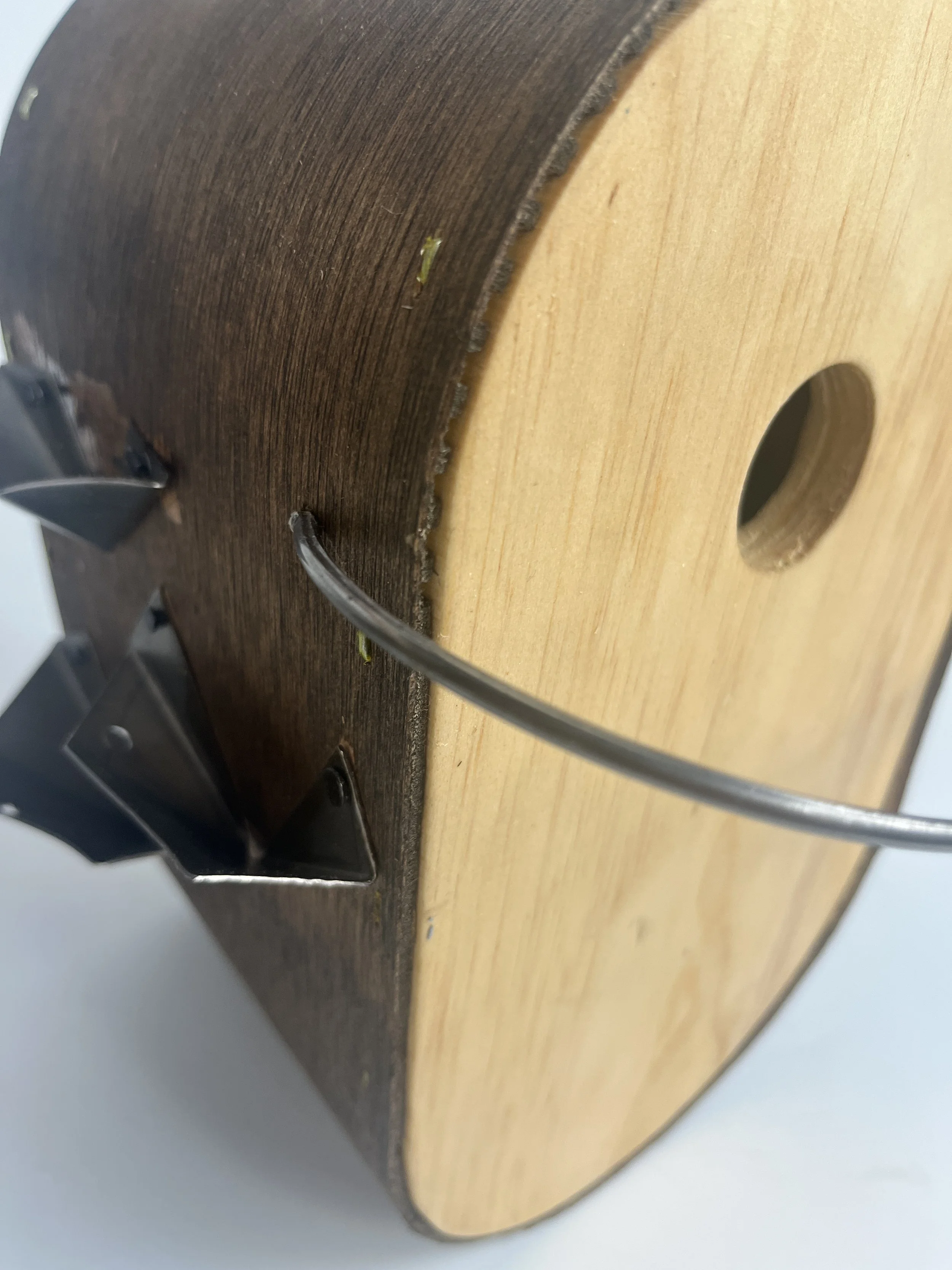Kerfing and moistening wood for bending, attaching metal cups, drilling entrance and hanging holes, cutting angled slots for sliding panel, attaching triangular rails to sliding panel, putting all the pieces together