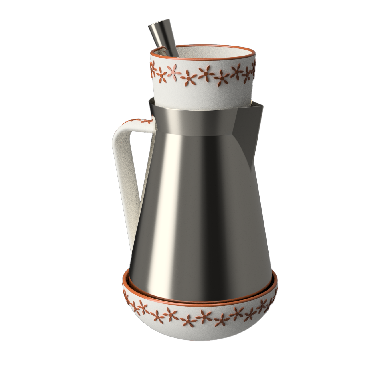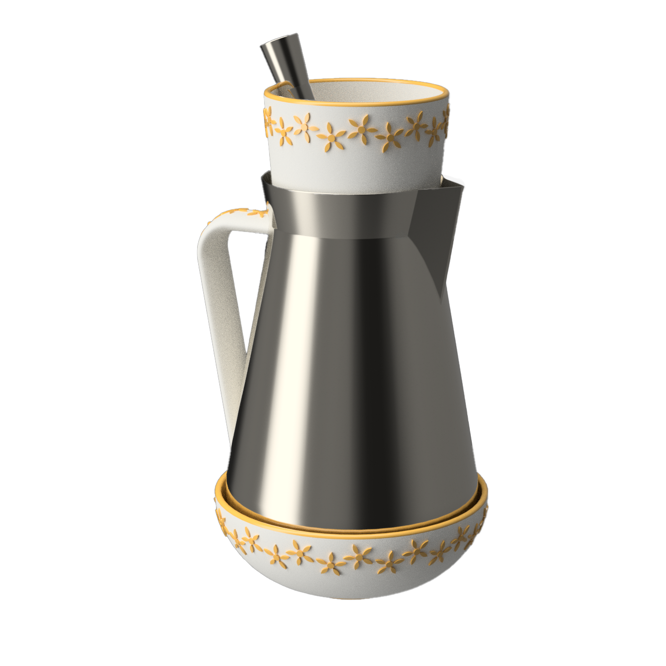 Metal portions would be stamp molded. Ceramic portions would be slip cast and then glazed appropriately. Pitcher’s handle attachment is detailed below.