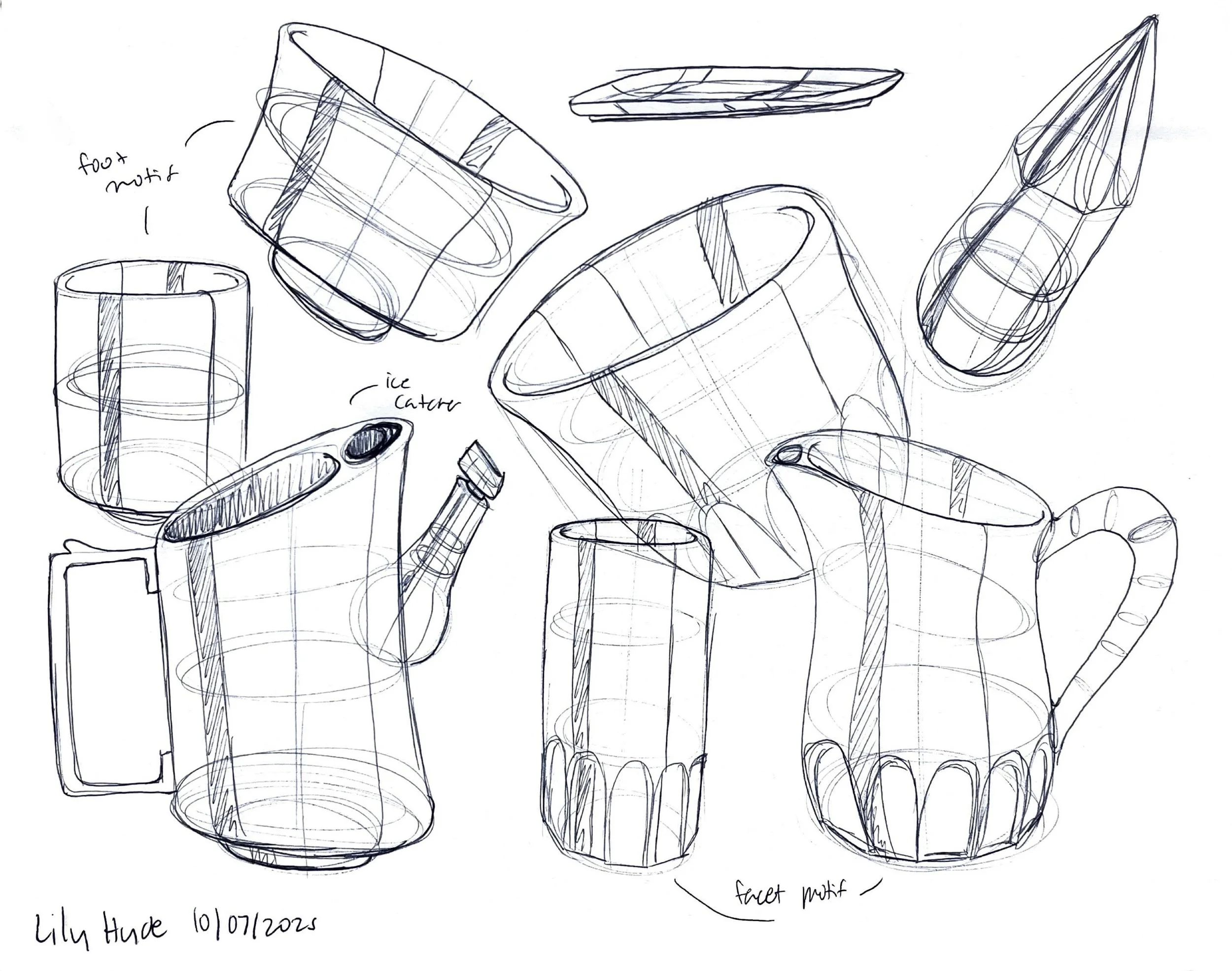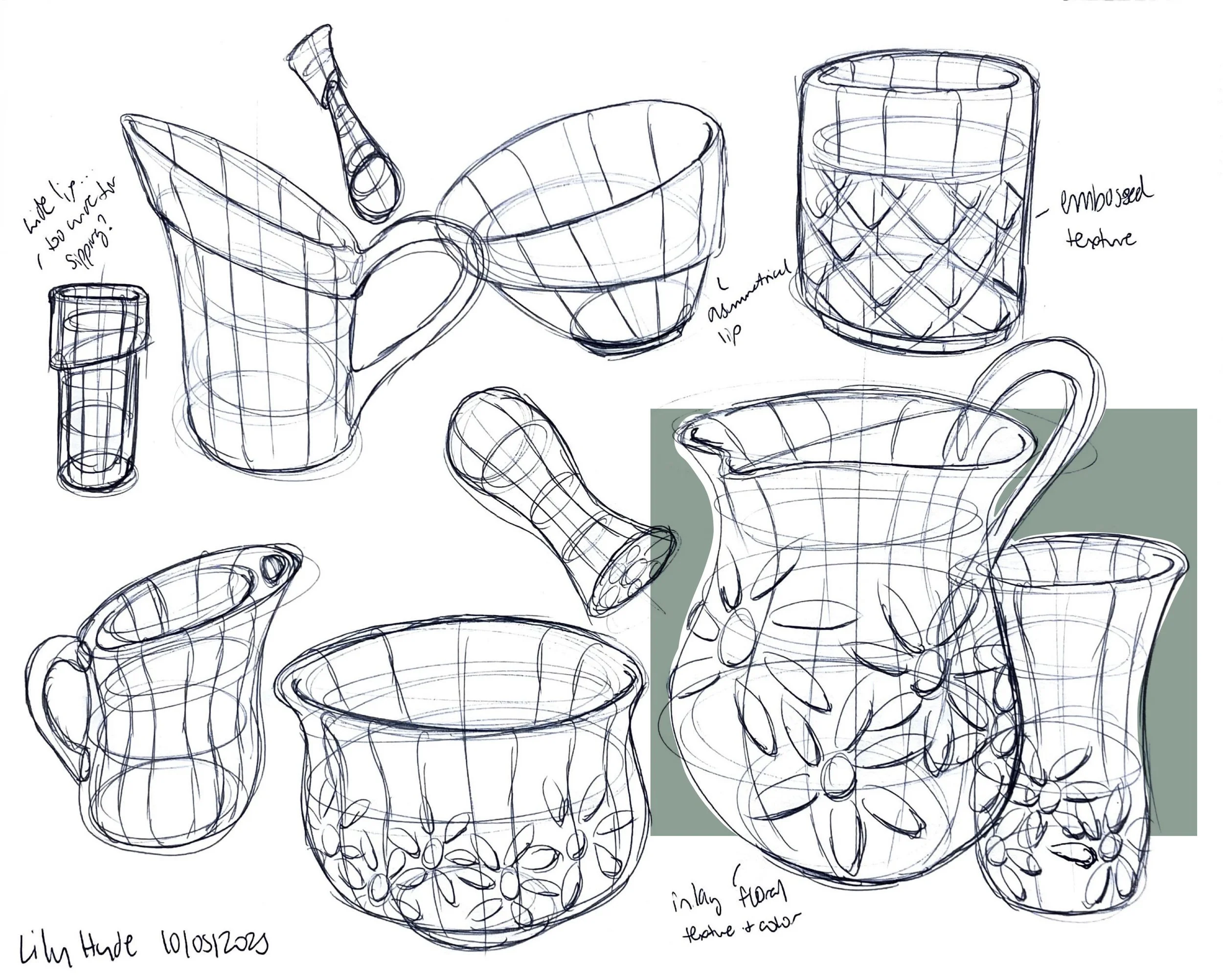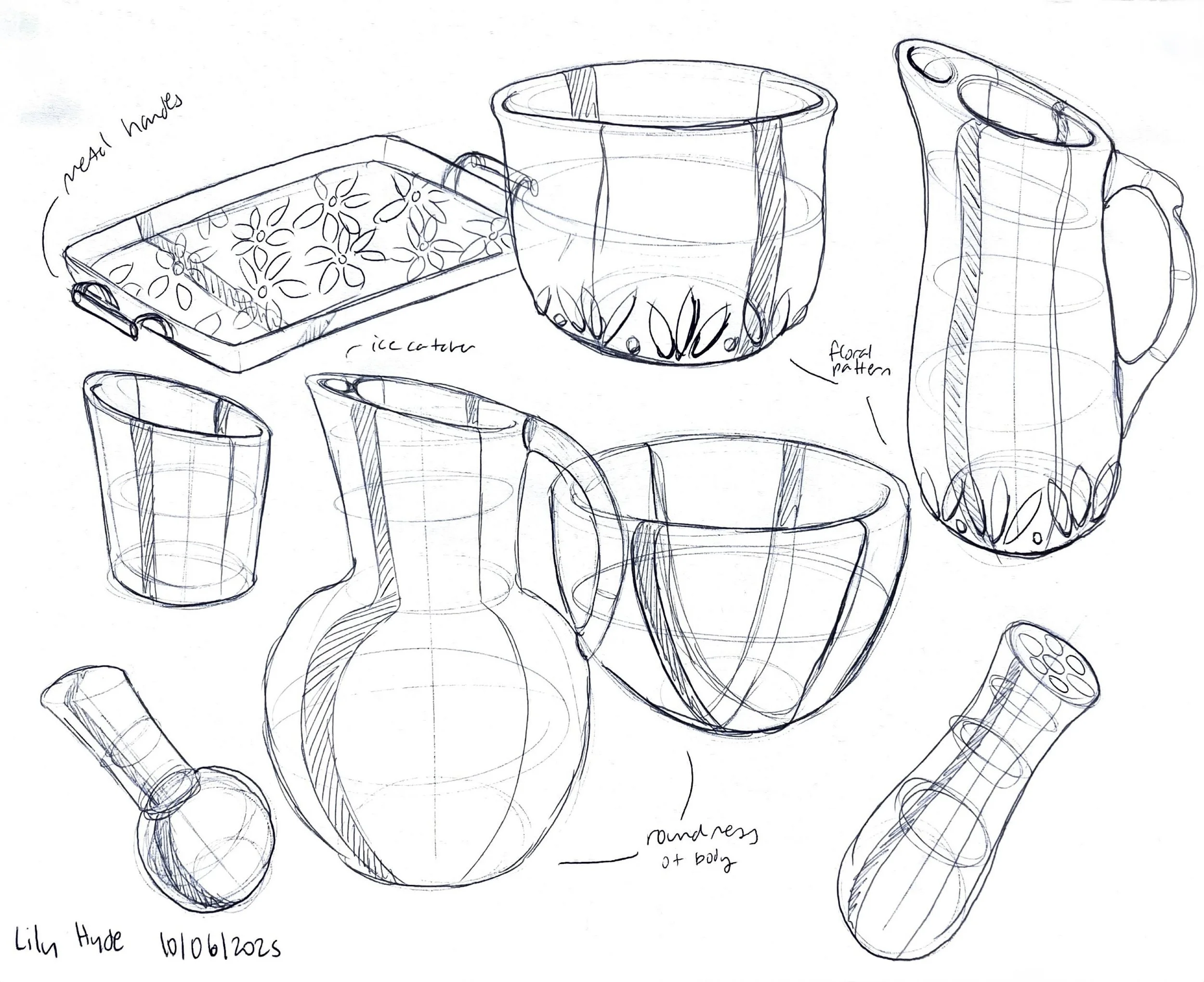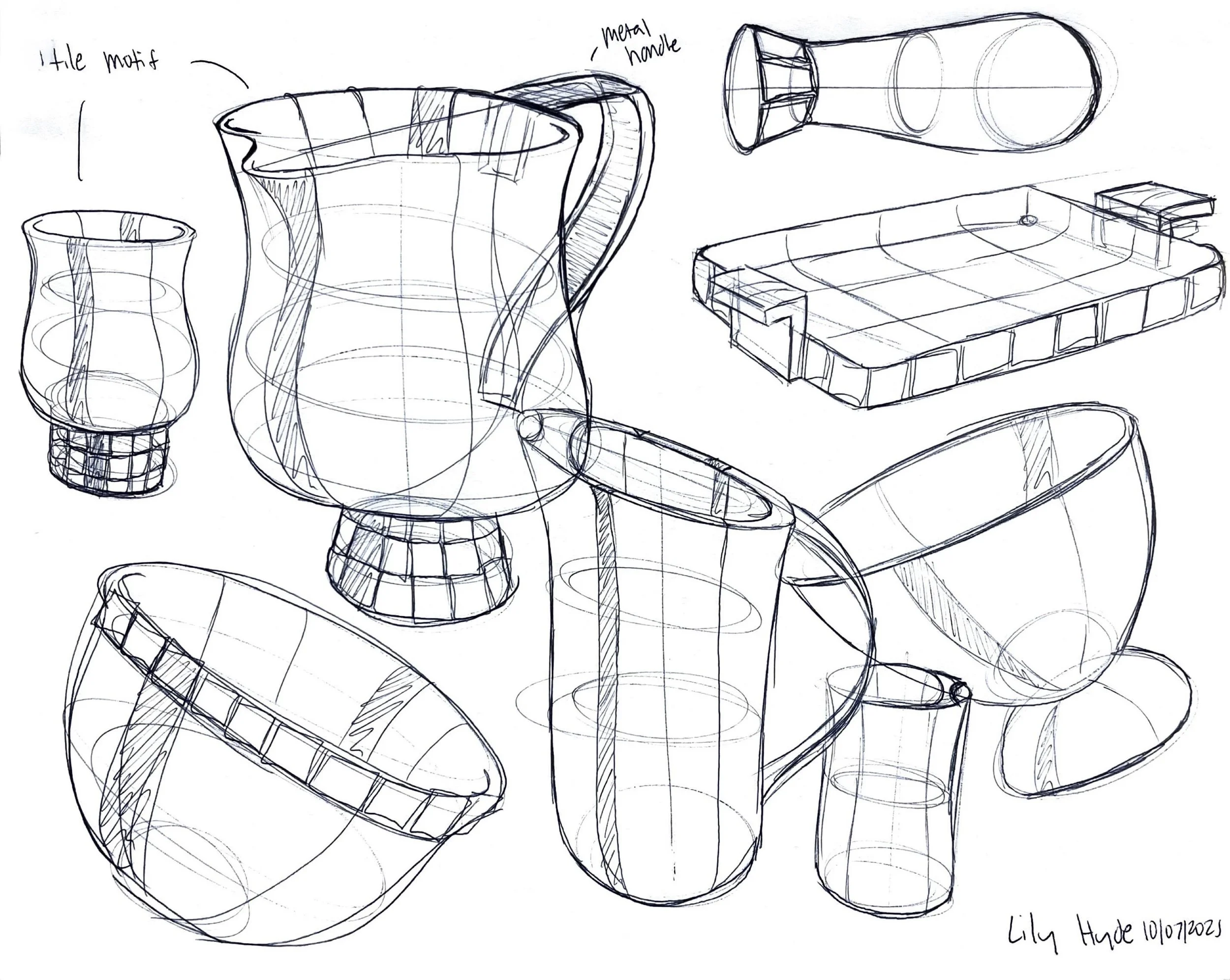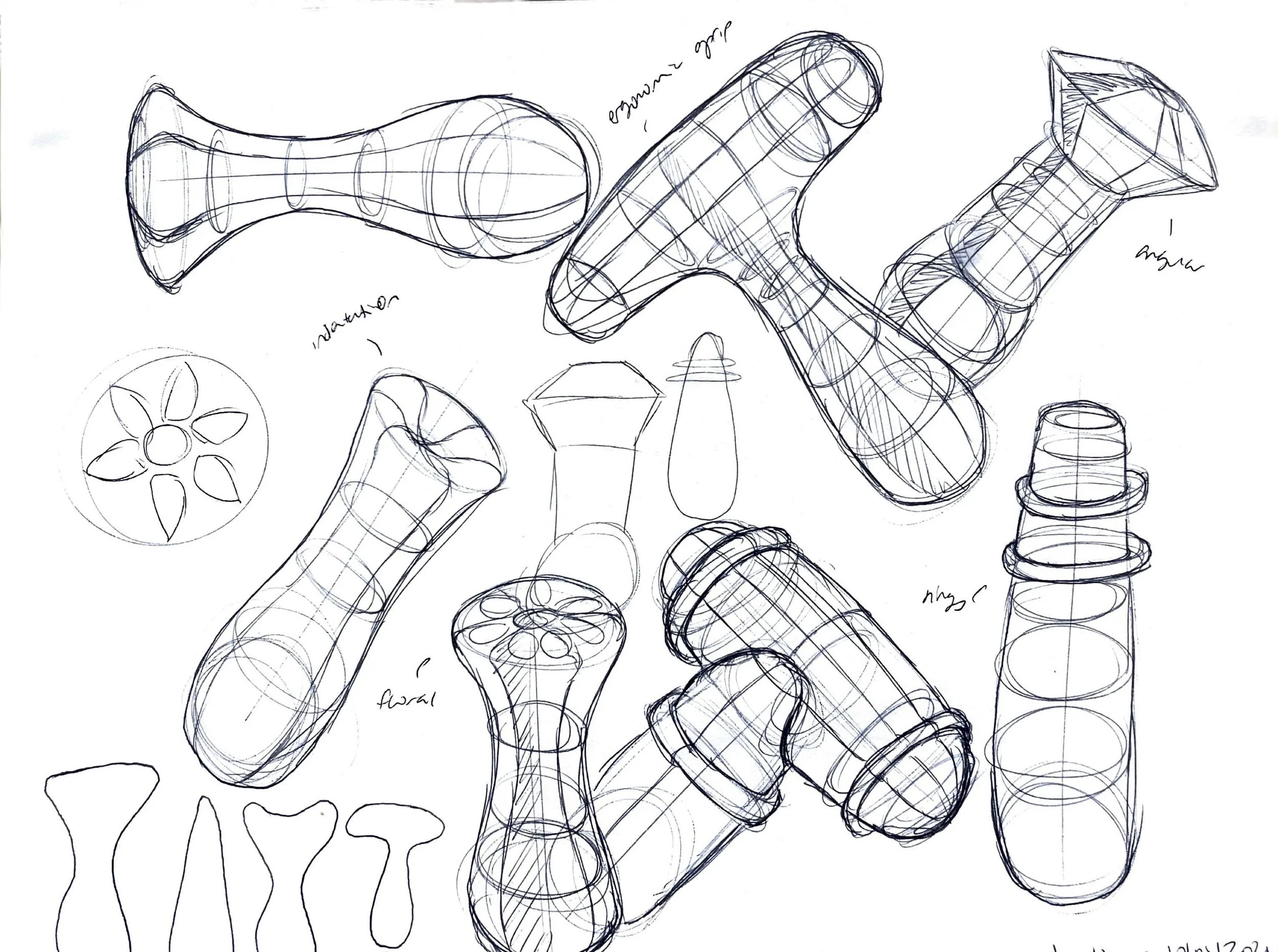 Exploring forms for different pieces, considering how pieces will be identified as a set, playing with ergonomic interactions