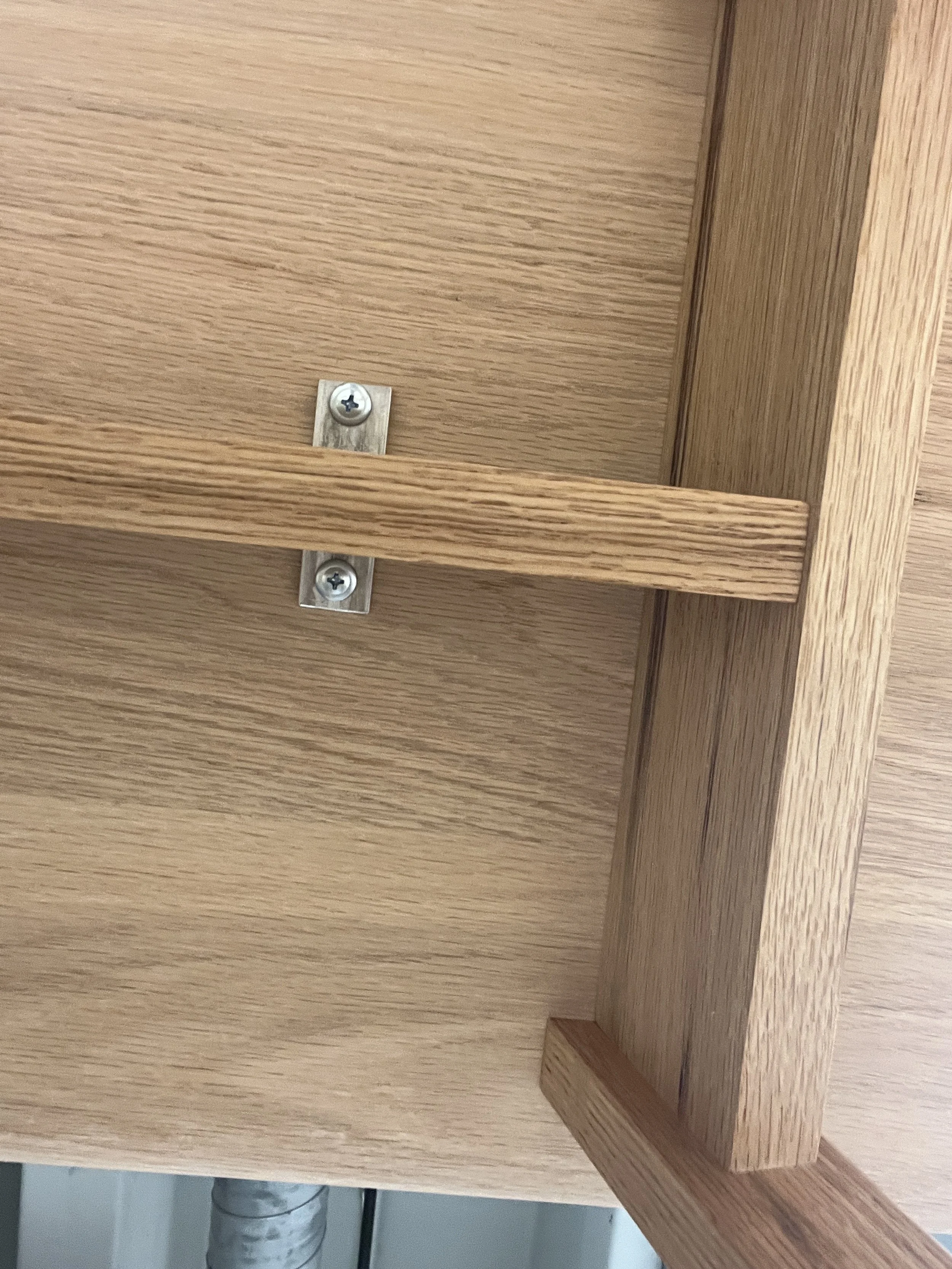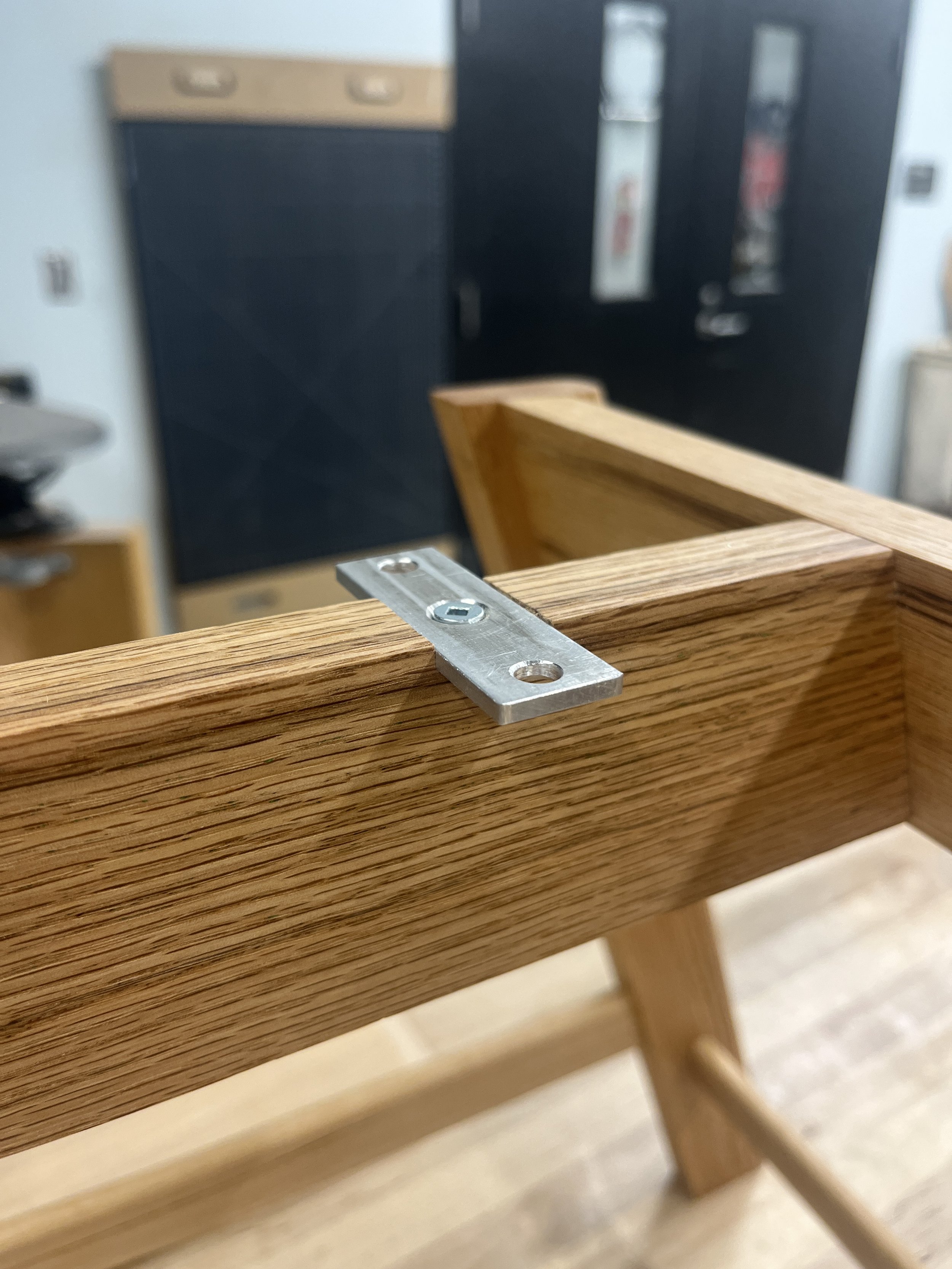 Two identical pieces of aluminum hardware are custom made to best fit into the piece. Each has three holes to allow one screw to lock into the supporting beam and two to attach to the table top.