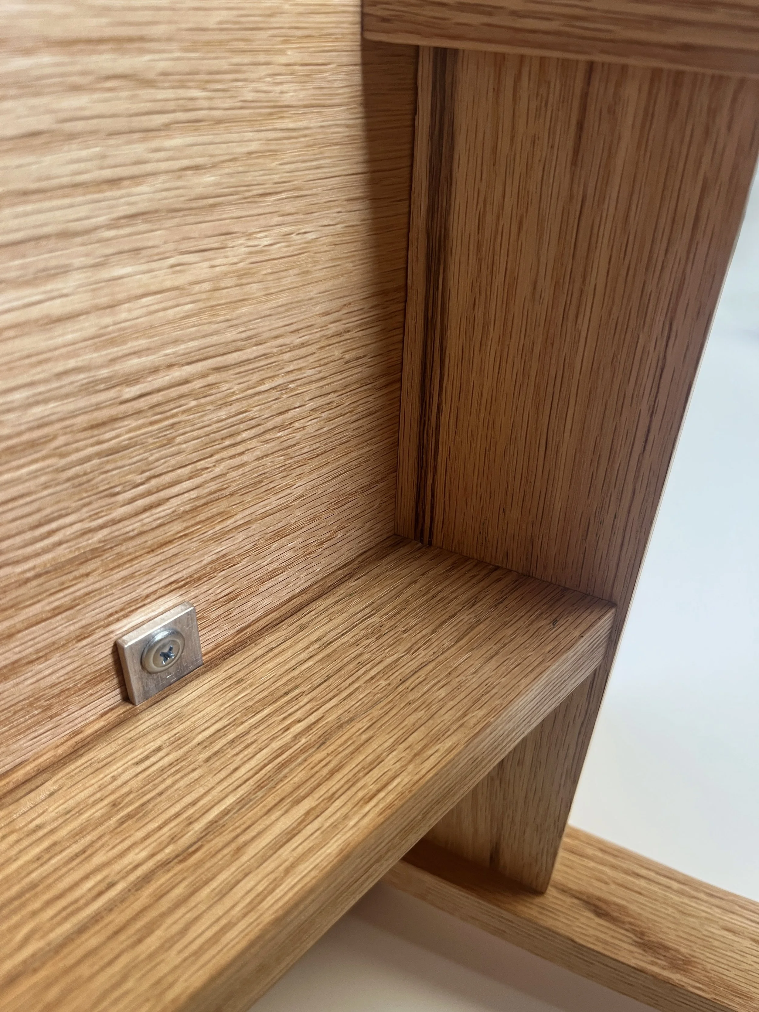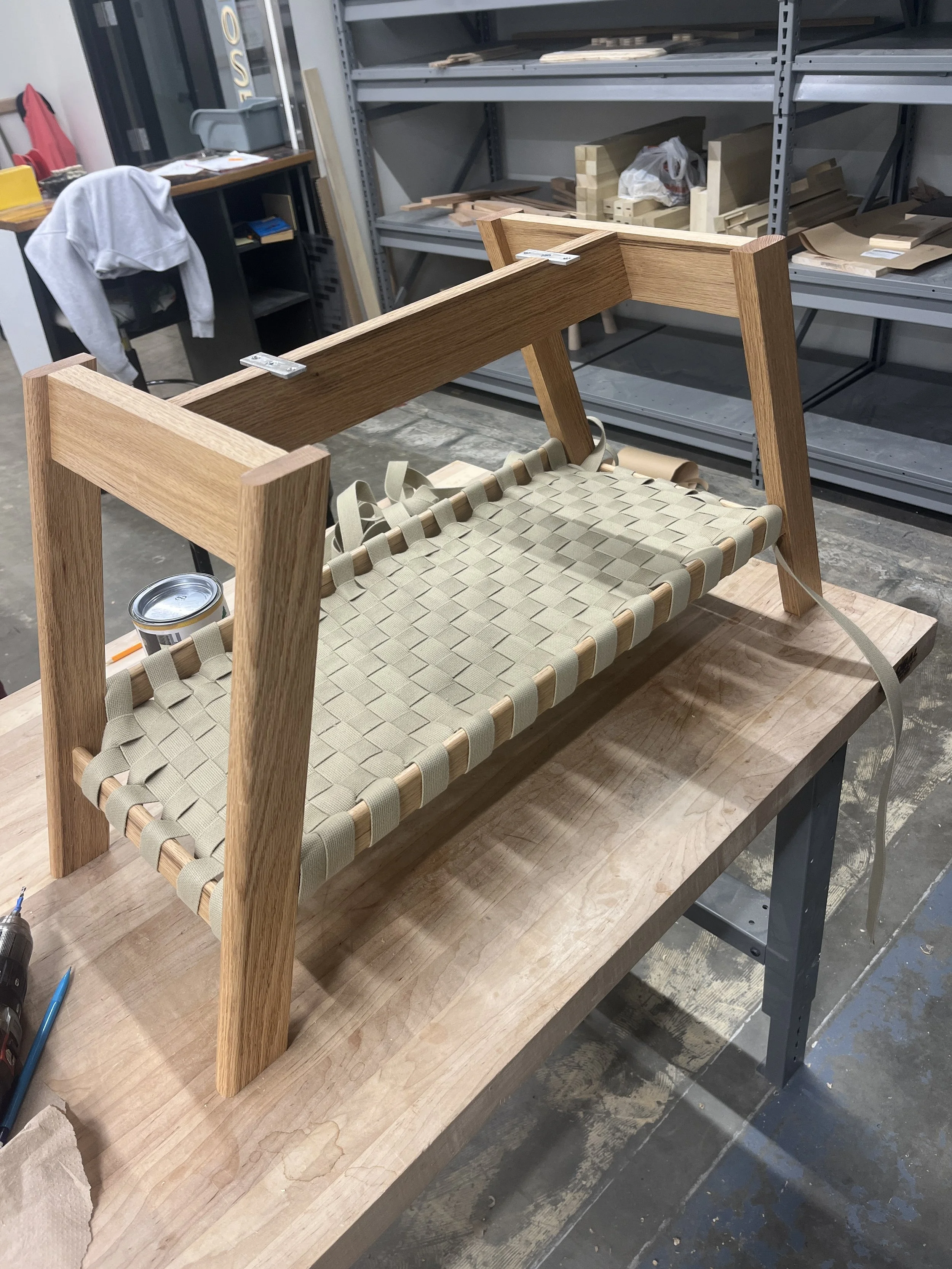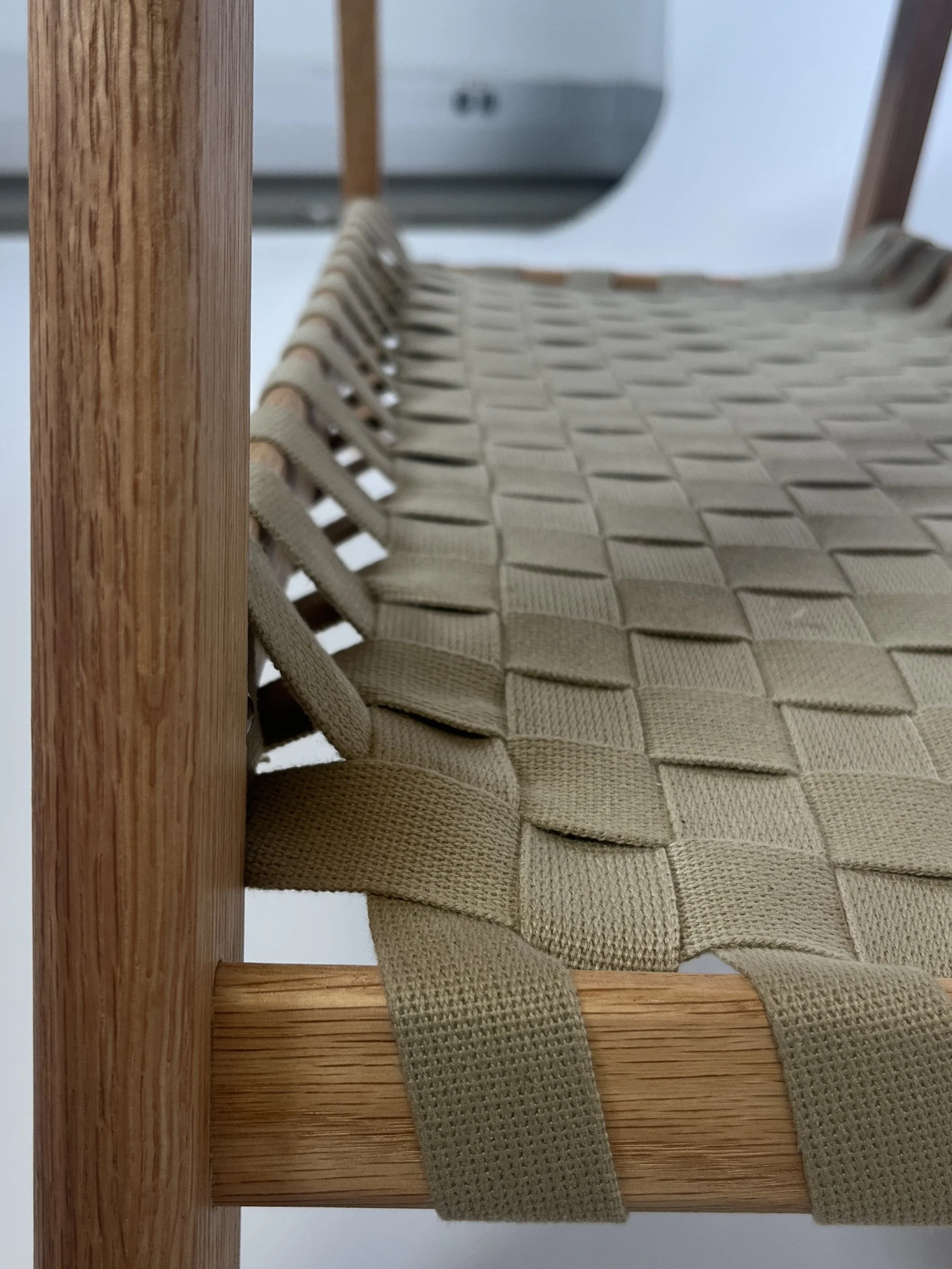Wood is finished with Osmo oil. Lower portion is woven using shaker tape and frame made by stretchers. Ends are tacked into legs subtly.