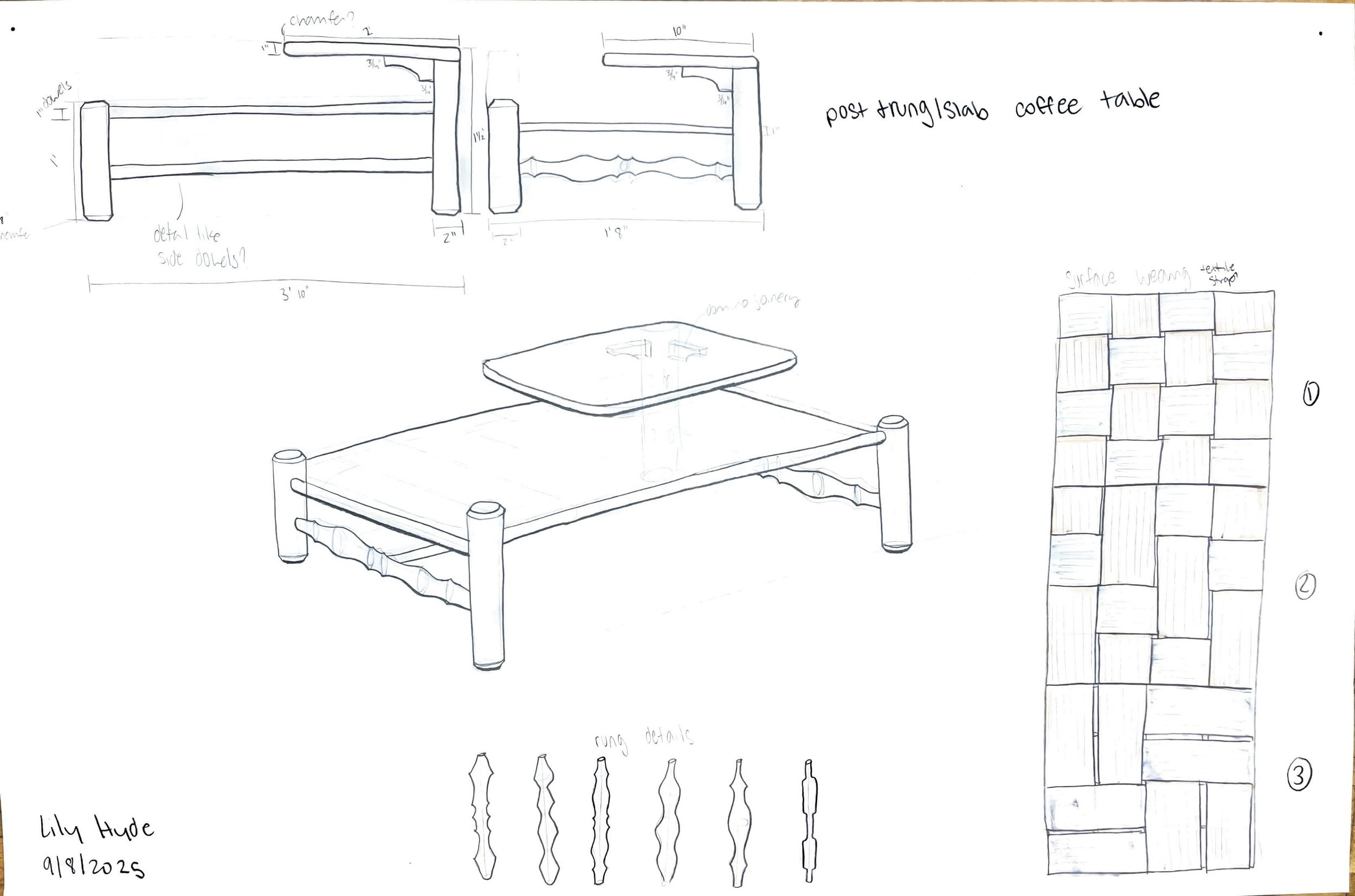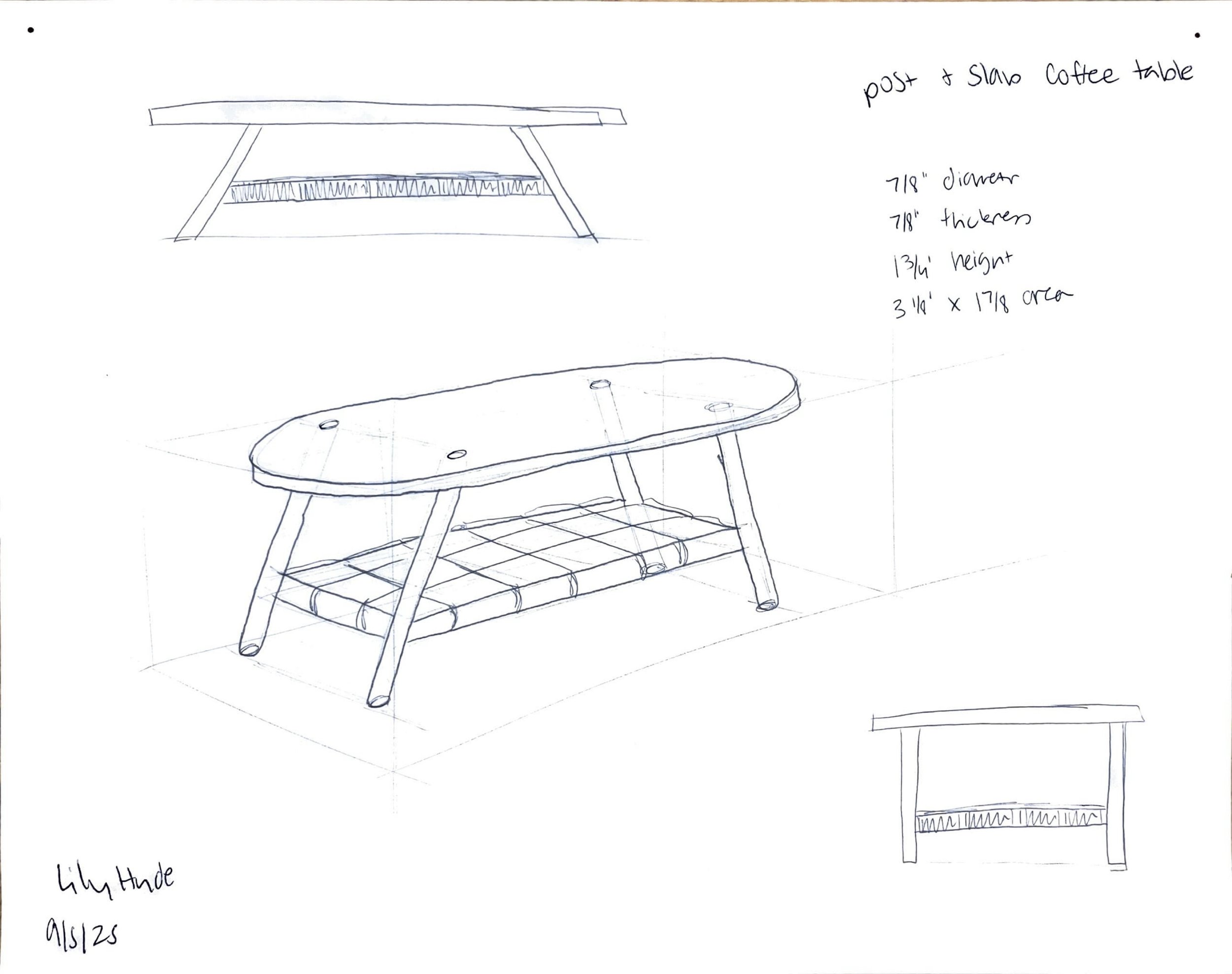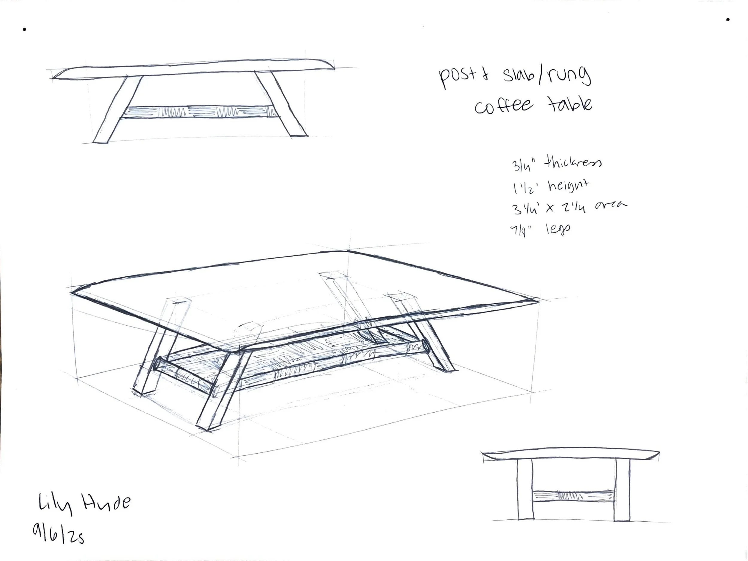 Coffee table purpose is chosen. Post and slab, post and beam, and post and rung structures are considered.
